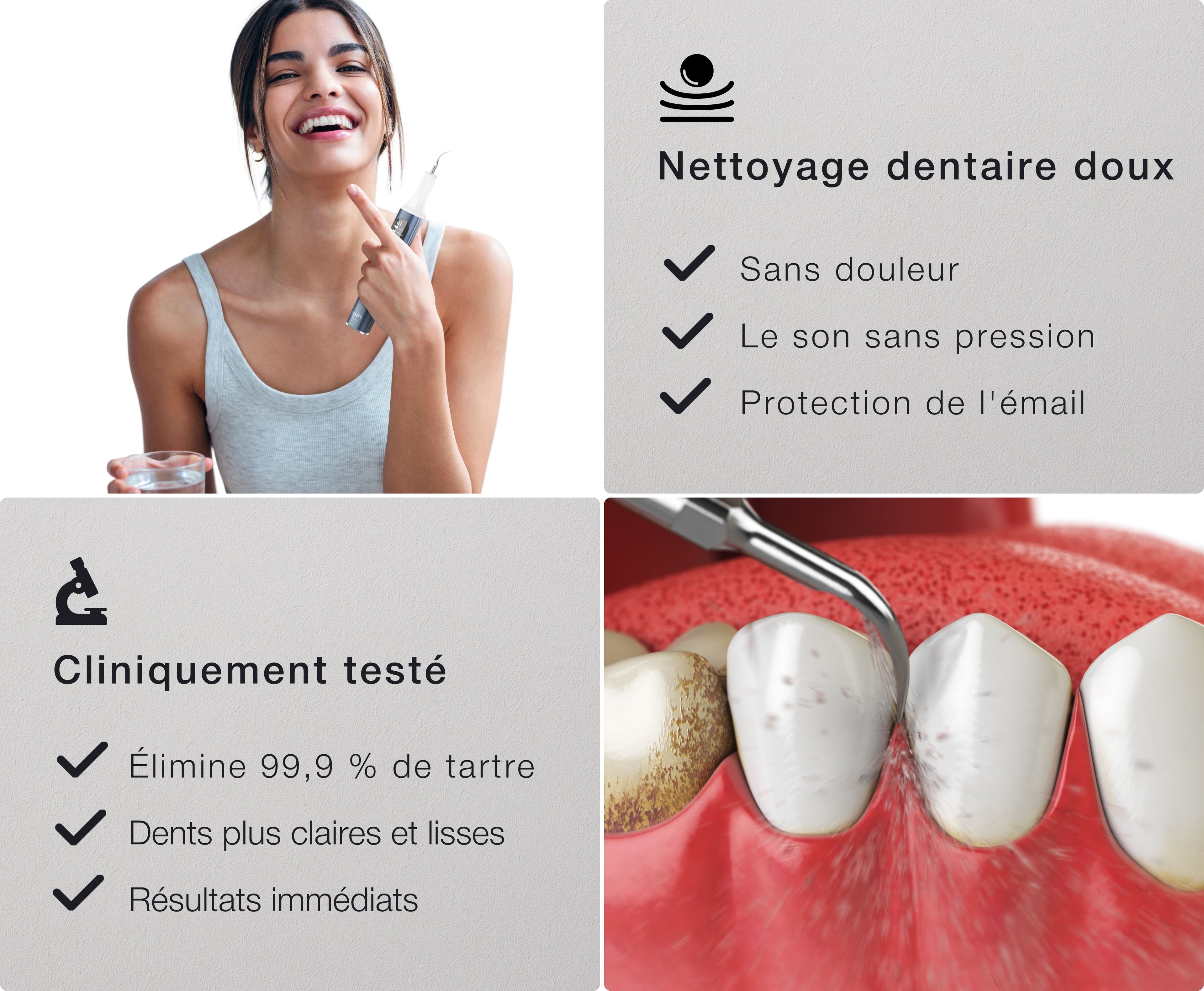 Découvrez une nouvelle façon de prendre soin de vos dents à la maison. ÉlimiTartre™ élimine le tartre en profondeur grâce à 2,5 millions de vibrations ultrasoniques par minute. LED de précision, design en aluminium et technologie allemande pour un nettoyage puissant et élégant.